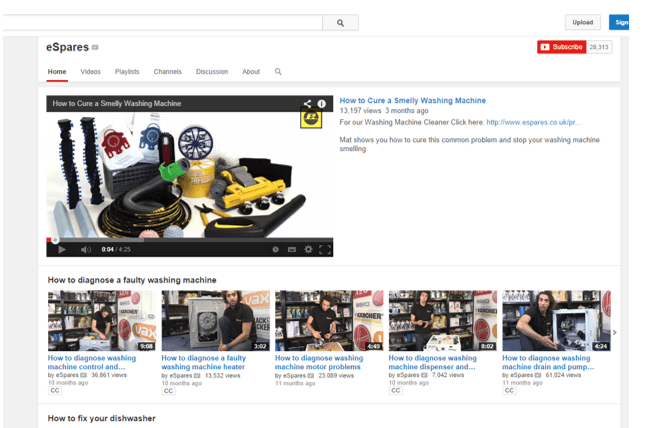 From how to cure a smelly washing machine to how to replace a dishwasher basket wheel, eSpares has built up a formidably helpful library of Video How to… guides on YouTube, offering tips and advice on just about every imaginable problem you could have with a household appliance. The format is very well established – all that’s needed is to create new videos as new questions arise.